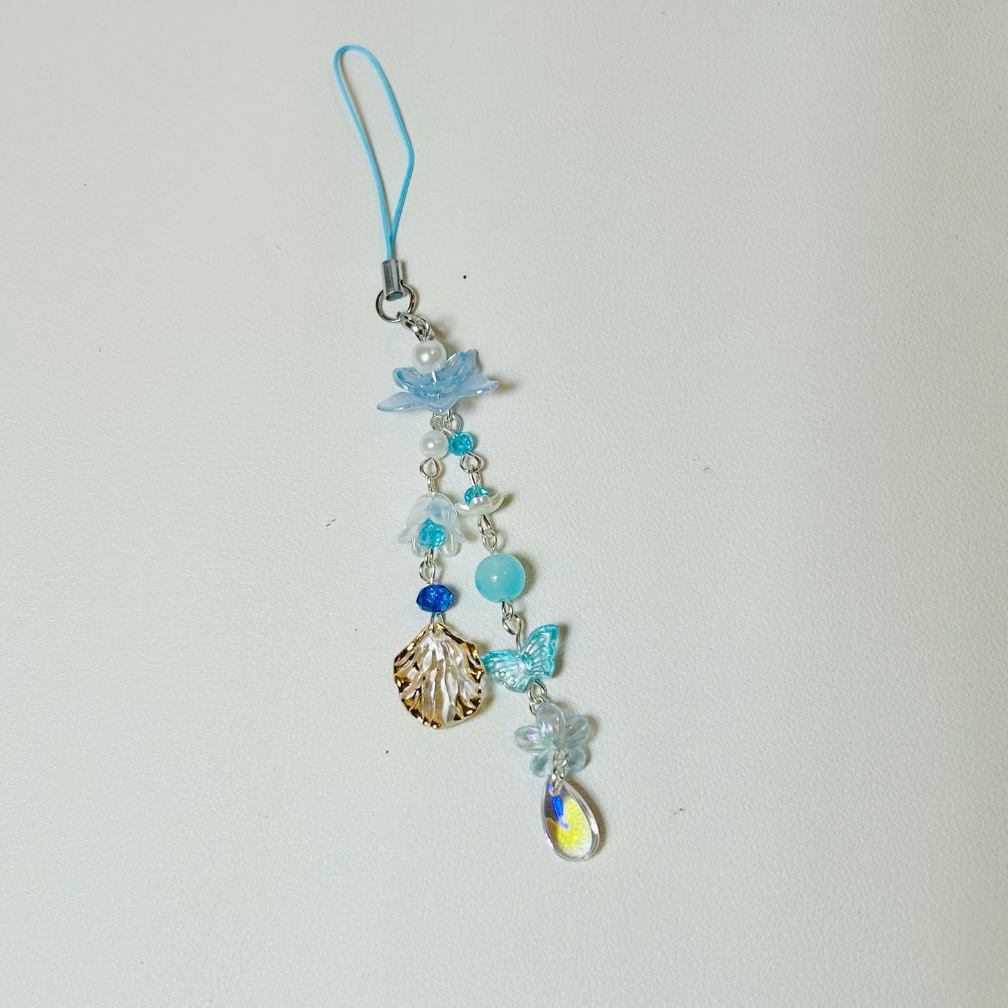 A handmade blue charm crafted with delicate beads, offering a simple yet timeless touch of elegance to add into your phone, keys or bags.